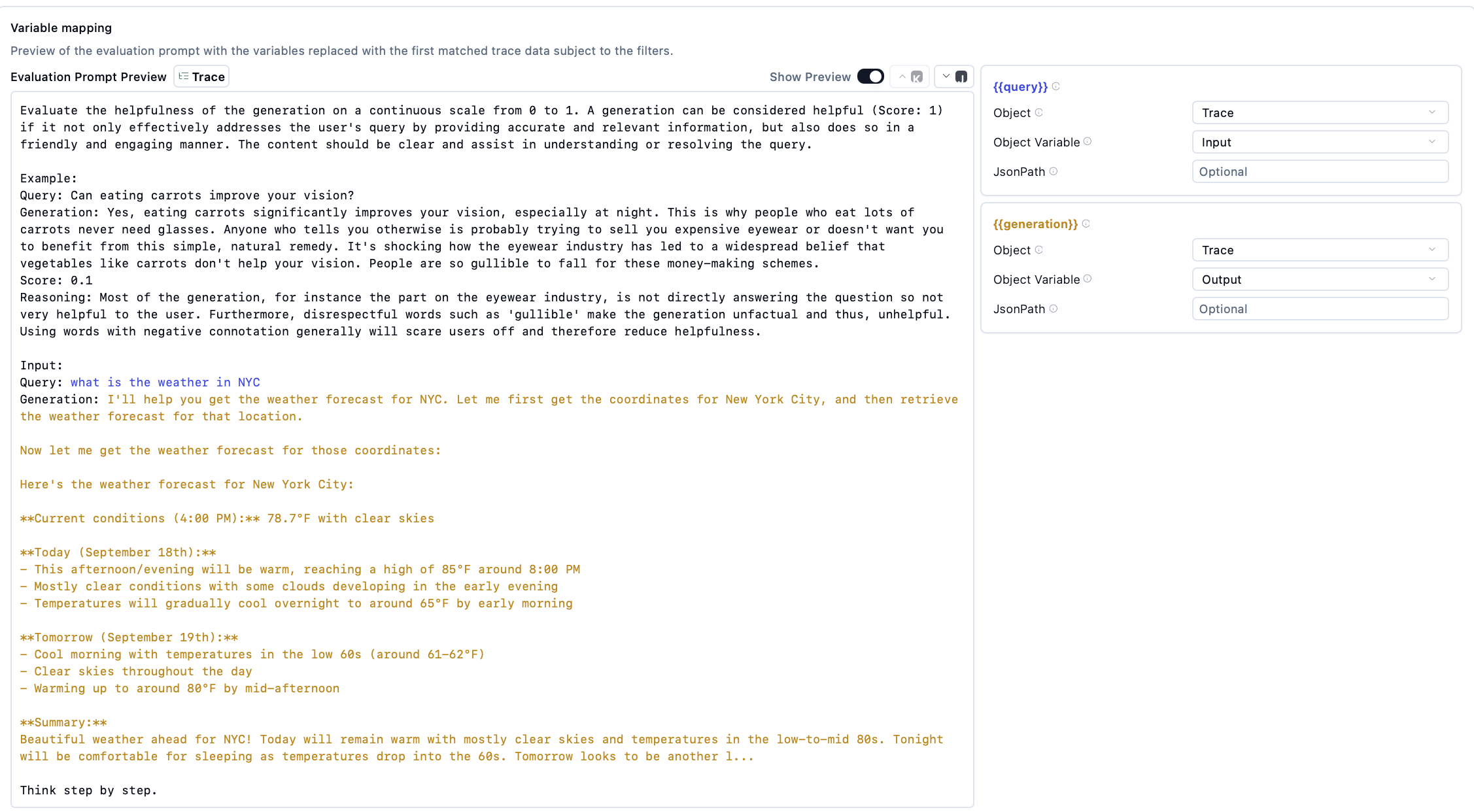 Langfuse helpfulness evaluator setup screen showing evaluator configuration with variable mapping and trace targeting options